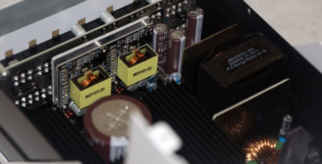 Высокое постоянное напряжение поступает на резонансный LLC-преобразователь, который понижает его до уровня +12 В. Стабилизацией шины занимаются MOSFET-транзисторы в схеме синхронного выпрямления, а для формирования черт +5 В и +3,3 В используются дополнительные DC-DC-преобразователи. Такая схемотехника обеспечивает питанием чувствительные компоненты (SSD-накопители, память, чипсет) и позволяет добиться высокого КПД — 92–94% в зависимости от нагрузки, что соответствует сертификации 80 PLUS Platinum.
