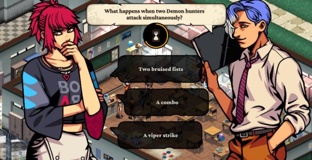 У такой беспредельной свободы есть свои недостатки. История о надвигающемся апокалипсисе плохо вяжется с распорядком дня Фэй, которая то песни распевает, то дегустирует блюда своей подруги, то покупает холодильник для помещения, где ребята обсуждают дальнейший действия. А некоторые забавы становятся рутинными — мини-игра в караоке, где вы подбираете правильные строки в зависимости от темы песни, надоедает очень скоро. К счастью, Demonschool не обязывает заниматься тем, что не приносит удовольствия, — максимальный уровень отношений с персонажами достигается различными способами, да и много времени это не занимает.