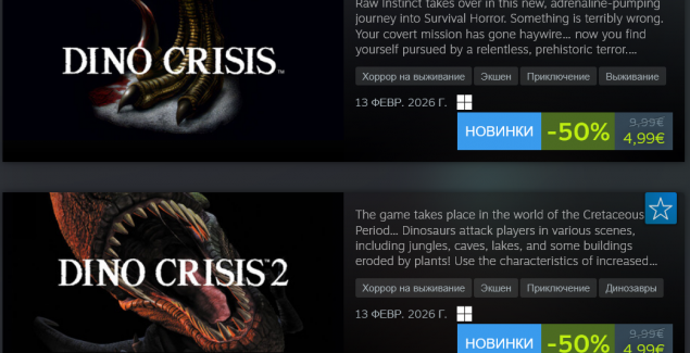 Dino Crisis и Dino Crisis 2 сделались доступны в магазине Valve со скидкой в 50%, которая действует до 26 февраля. В отличие от GOG-версий, релизы в Steam используют антипиратскую защиту Enigma.