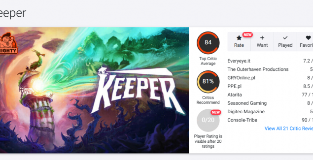 Критики положительно приняли Keeper. Средняя оценка игры на OpenCritic закрепилась на оценке в 84 балла. Журналисты называют работу Double Fine душевным и очень атмосферным приключением, которое идеально подходит для осеннего вечера. Однако она может прийтись далеко не всем.