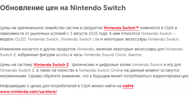 Цены на консоли Nintendo Switch 2, а также игры для двух поколений консолей пока не будут корректироваться. Но компания предупредила, что в ближайшем будущем позиция может измениться.