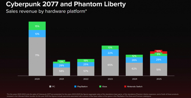 По этим компании, в 2020 году компьютерная версия Cyberpunk 2077 сгенерировала около 71% дохода от продаж, после чего — в последующий годы — стабильно приносила по 50-65%, опережая все консоли совместно взятые.