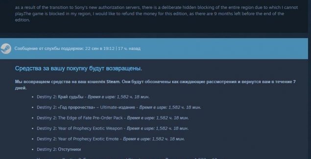 В случае Destiny 2 игроки проявили позицию, начав спрашивать возврата средств, потраченных на игру. Удивительно, но администрация цифрового магазина Steam начала оформлять рефанды, даже если пользователи прочертили в игре больше двух часов, оговорённых в правилах.
