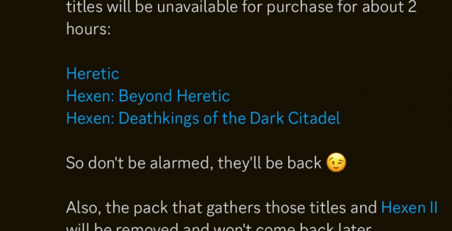 Более того, GOG изымет целиком из продажи сборник, который включает в себя вышеуказанные проекты и Hexen II. В связи с этим не исключено, что стоит ожидать анонса ремастеров Hexen и Heretic.