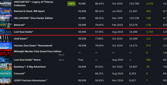 По итогам первого дня пиковый онлайн Lost Soul Aside в Steam составил итого 3 тысячи человек — это один из худших результатов среди всех игр Sony Interactive Entertainment. Данные представлены площадкой SteamDB.